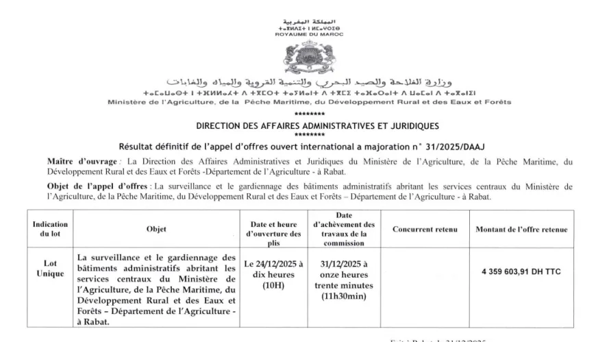 الوثيقة الصادرة عن مديرية الشؤون الإدارية والقانونية بالوزارة، تكشف عن حسم صفقة حراسة قدرت قيمة العرض الذي تم قبوله لـ “الحراسة” بمبلغ 4,359,603.91 درهم (أي ما يقارب 436 مليون سنتيم) في 31 دجنبر 2025، وهو الوقت الذي كان فيه المغرب يشهد نقاشا حادا حول قانون المالية والتدابير الاستعجالية لمواجهة التضخم.